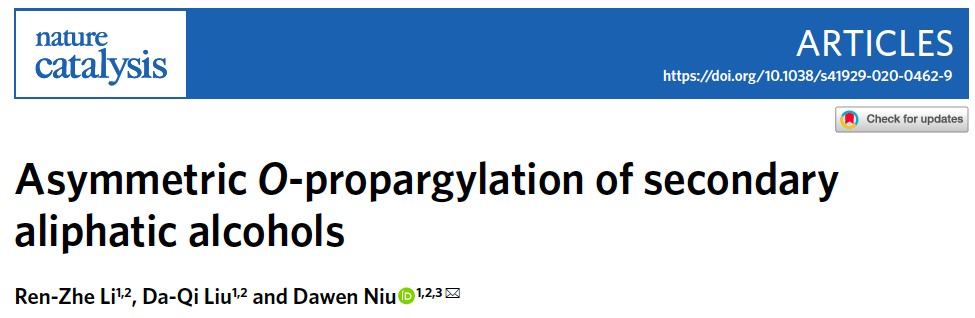 1. Ren-Zhe Li, Da-Qi Liu, and Dawen Niu, Asymmetric O-Propargylation of Secondary Aliphatic Alcohols. Nat. Catal. 2020 (DOI:10.1038/S41929-020-0462-9).