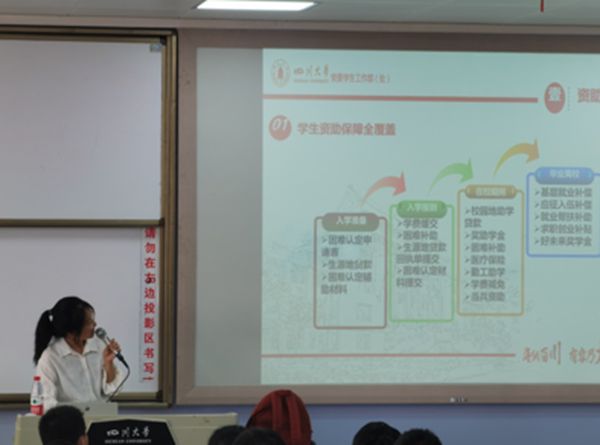 2020年9月23日,我们邀请学工部学生资助中心卢婕老师为2020级新生做资助政策宣讲。活动在江安第一教学C座407进行,2020级本科生以及新生辅导员参加活动。
