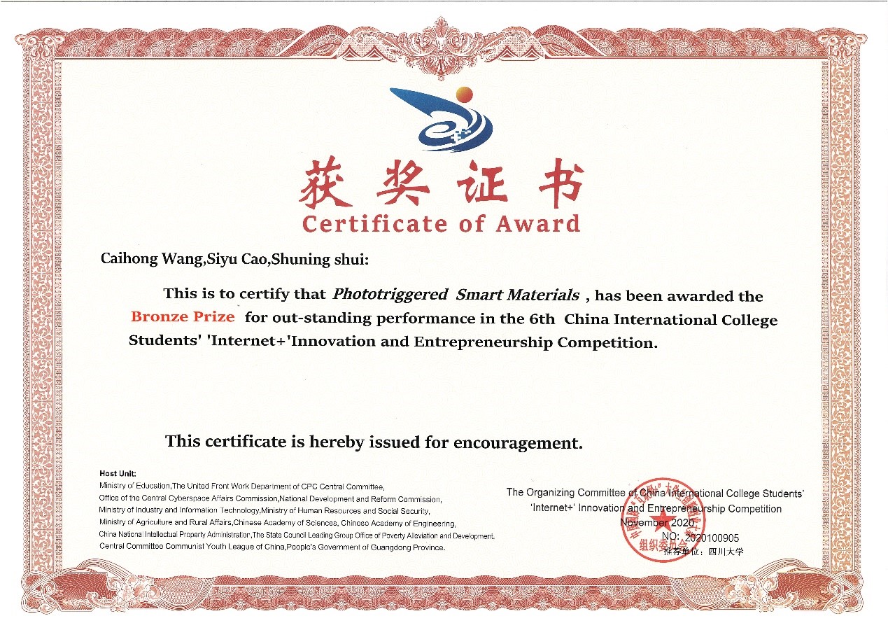 2020年11月,第六届中国国际“互联网+”大学生创新创业大赛总决赛在华南理工大学举行。经过激烈角逐,我们王彩虹老师的参赛项目“Phototriggered Smart Materials”获全国总决赛铜奖,成为我们国际赛首次荣获国家级奖,实现了此重大赛事全赛道的国奖全覆盖。通过邀请全球优秀青年一同参与此项赛事,汇聚创新思维、同场竞技、交流协作、共同成长,进一步促进我们创新创业教育的国际融合发展。