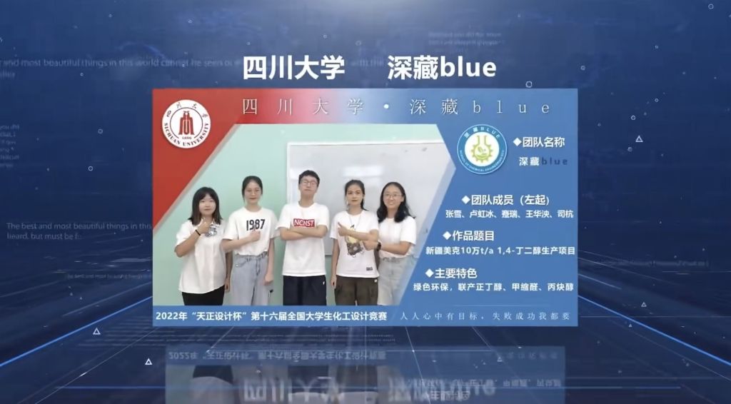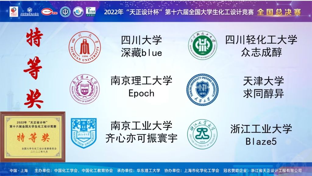 2022年“天正设计杯”第十六届全国大学生化工设计竞赛全国总决赛于8月16日-8月22日在线上举办,由华东理工大学承办。共有60支队伍参加了全国总决赛。受新冠肺炎疫情影响,今年全国总决赛专项评审、答辩环节均在线上进行,304永利集团官网入口“深藏blue”团队不惧强敌,凭借高质量的设计作品、饱满的工作量、清晰流畅的讲解,获得了专项评委和现场答辩评委的一致认可,再次荣获全国特等奖的殊荣。本次竞赛,304永利集团官网入口共获得全国特等奖一项、全国二等奖一项及西南赛区特等奖等奖项。