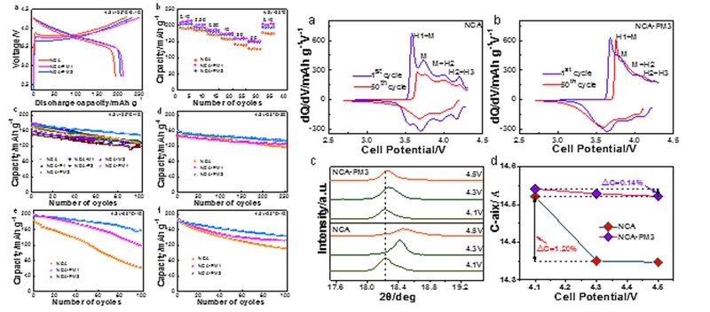 Fig. 4 (a)0.1 C倍率下首圈充放电曲线:NCA,NCA-PM1,NCA-PM3。(b)倍率图:NCA,NCA-PM1,NCA-PM3。(c)1C循环图。(d)5C循环图。(e)55°C,1C高温循环图。(f)4.5V,1C循环图。