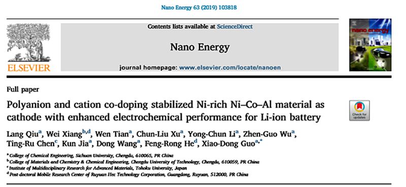 Lang Qiu, Wei Xiang, Wen Tian, Chun-Liu Xu, Yong-Chun Li, Zhen-GuoWu,Ting-Ru Chen, Kun Jia, Dong Wang, Feng-Rong He and Xiao-Dong Guo*.Polyanion and cation co-doping stabilized Ni-rich Ni–Co–Al material as cathode with enhancedelectrochemical performance for Li-ion battery,doi.org/10.1016/j.nanoen.2019.06.014.