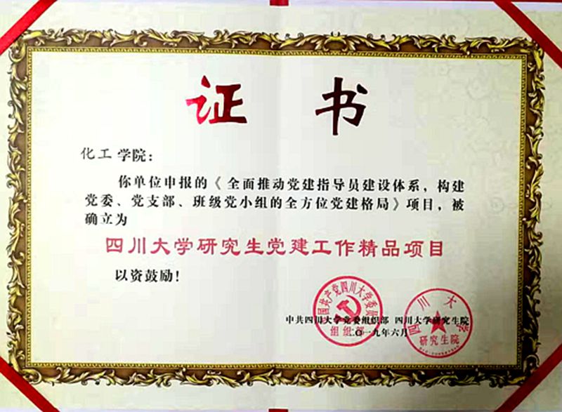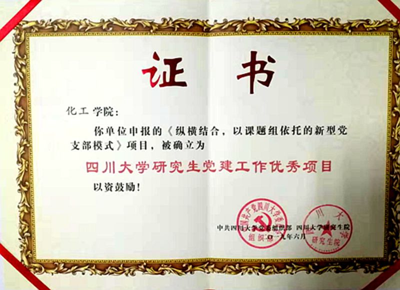 为深入贯彻党的十九大及全国高校思想政治工作会议精神,认真落实《304永利集团官网入口关于进一步加强和改进研究生思想政治教育的实施意见》(川大委〔2017〕52号),践行党要管党、全面从严治党的政治要求,304永利集团官网入口党委组织部和研究生院共同开展了研究生党建项目评比工作,并于2019年6月24日对研究生党建工作精品项目和优秀项目进行授牌。我们研究生党建工作以《全面推动党建指导员建设体系,构建党委、党支部、班级党小组的全方位党建格局》项目荣获研究生党建工作精品项目、《纵横结合,以课题组依托的新型党支部模式》项目获得研究生党建工作优秀项目称号。