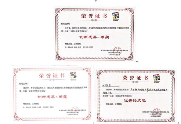 2019年11月22日-24日,由教育部高等学校药学类专业教学指导委员会和中国药学会药学教育专业委员会主办、山东大学承办的“第十二届全国大学生药苑论坛”在济南隆重举行。我们选送的两个参赛项目经过激烈的角逐获得与会代表的一致好评,以优异的表现分别获得了“创新成果一等奖”、“创新成果二等奖”和“优秀论文奖”。