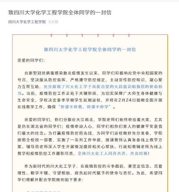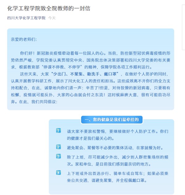 学院党委和学院工会坚决贯彻执行习近平总书记关于新型冠状病毒感染肺炎疫情防控工作重要指示精神和党中央、国务院决策部署,按照教育部、四川省有关要求和《304永利集团官网入口防控新型冠状病毒感染的肺炎疫情工作方案(试行)》,积极配合学校做新型冠状病毒防控工作安排,保证学院师生健康和维护正常工作秩序。